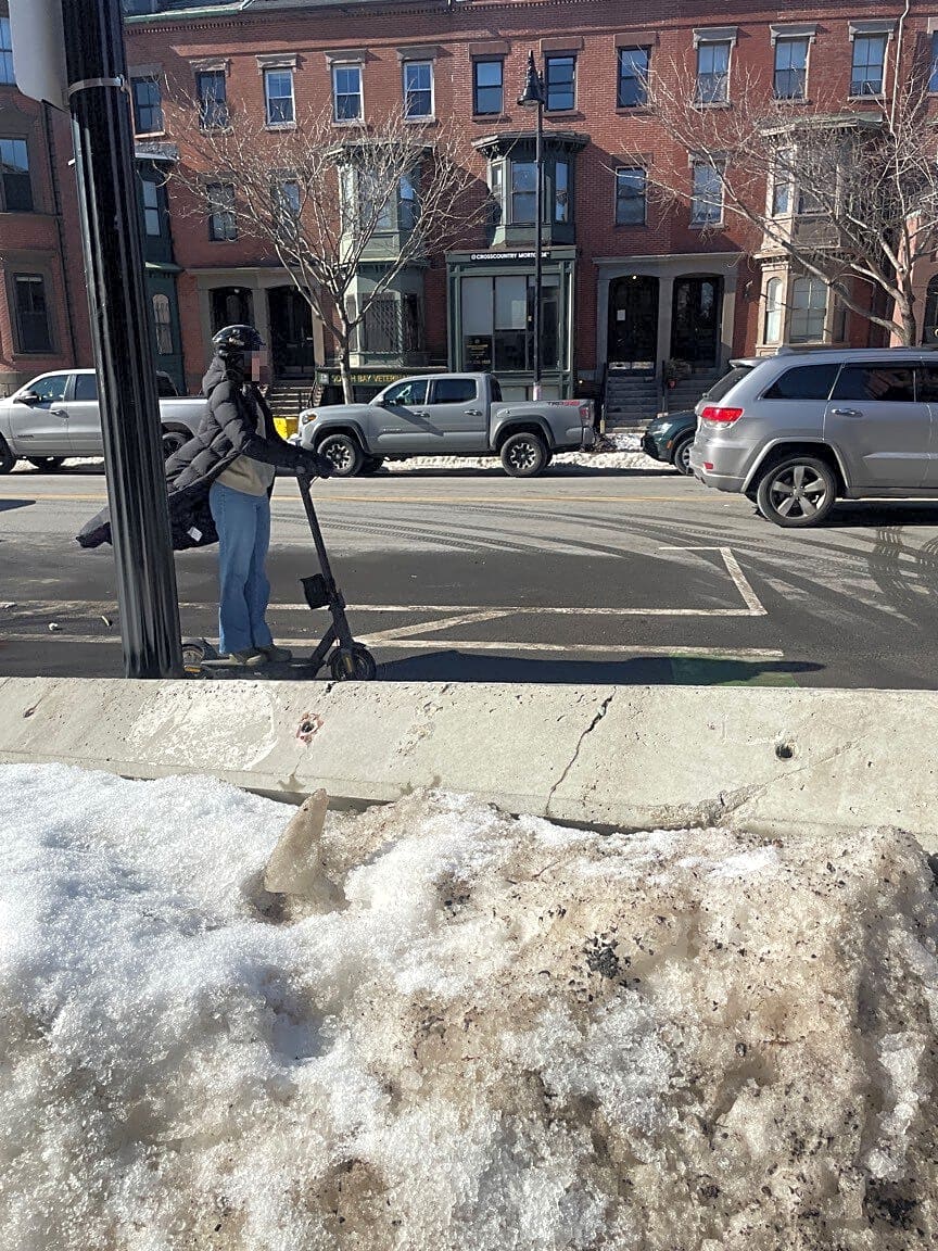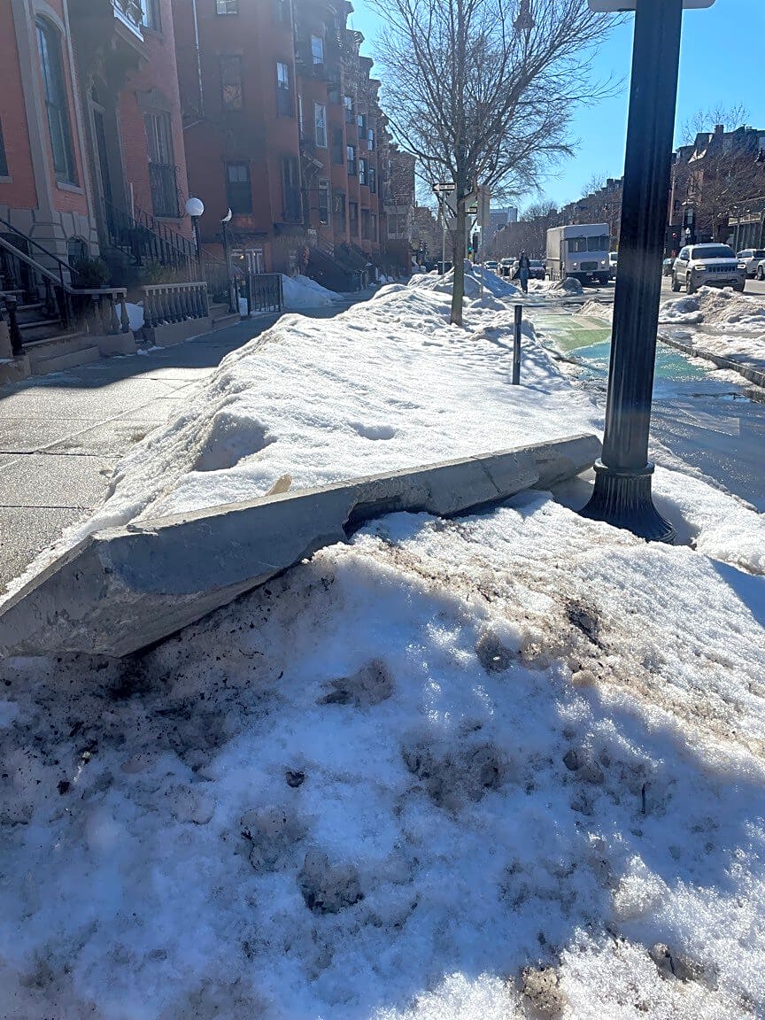 Intersection Of Upton St And Tremont St, Roxbury, MaBike lane cement dmaged from snow plows maybe. Needs to be removed. 596 Tremont.