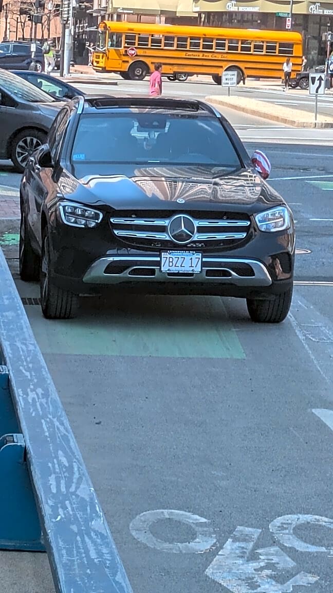 Intersection Of Oliver St And Seaport Blvd And Atlantic Ave, Boston, MaBlocking the bike lane on the corner of seaport blvd and Atlantic Ave. This is a continuous problem with the workers in the building under construction.
