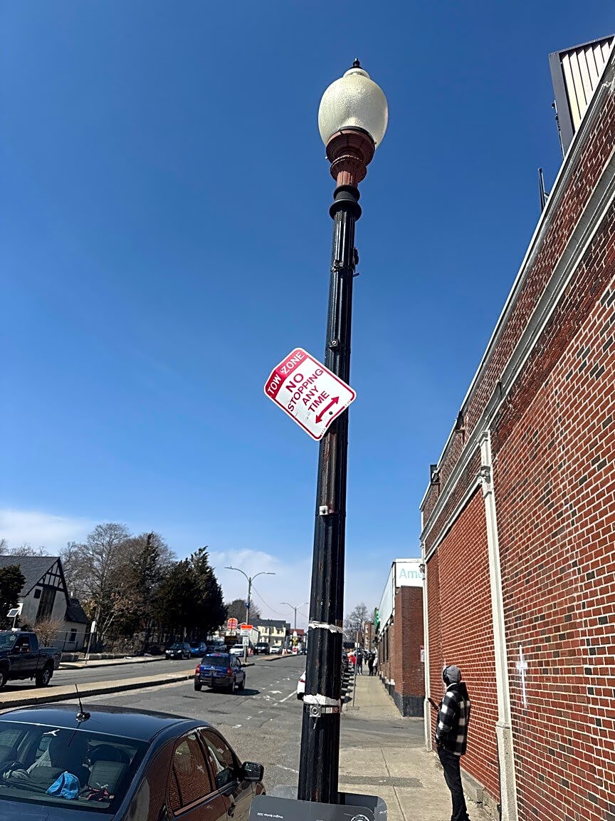 Intersection Of River St And Cummins Hwy, Mattapan, MaBroken sign about to fall