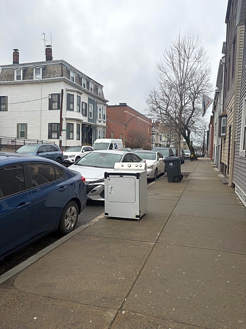 Intersection Of Saratoga Pl And Saratoga St, East Boston, MaA whole washer or dryer machine out on the sidewalk for trash