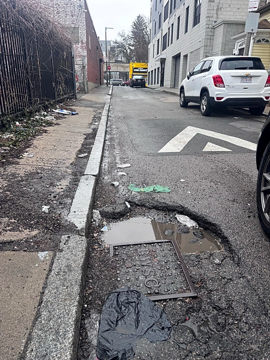 11 Wendover St, Dorchester, Ma, 02125Deep Pothole, hard to avoid, narrow street with cars parked on the opposite side of the street