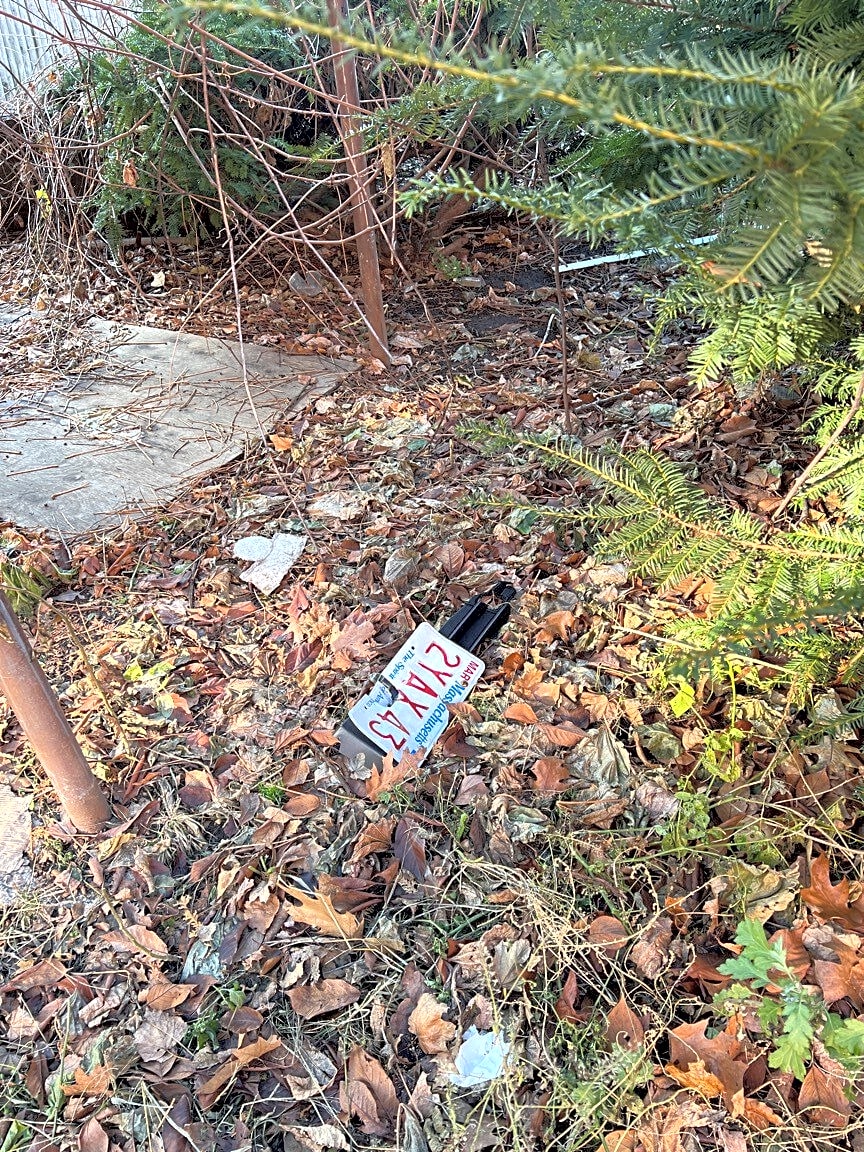 3502 Washington St, Jamaica Plain, Ma, 02130Discarded license plate MA 2YAX43 and part of car fender (potentially stolen?) in bushes along roadside