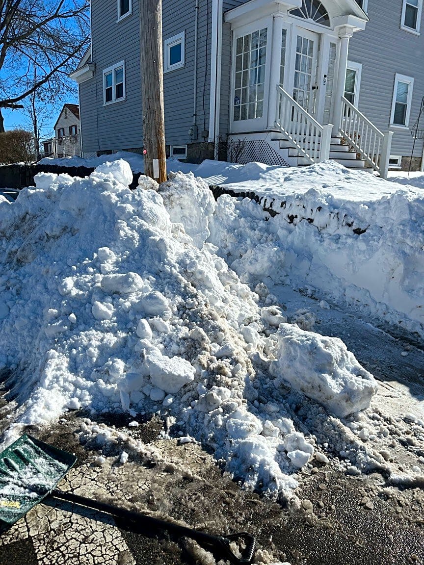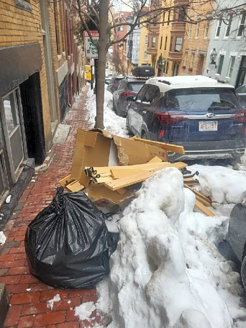 404 Huntington Avenue/Westminster Street. City plow at the property earlier today, and cleared a very small portion of snow mounted on sidewalk from city. Homeowner cannot remove pile of snow left behind at corner which overflows to sidewalk.