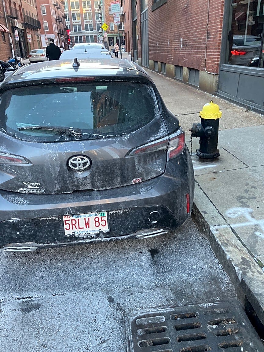 Jeep SUV parked 3 feet over curb blocking in double parked on legally parked Honda
