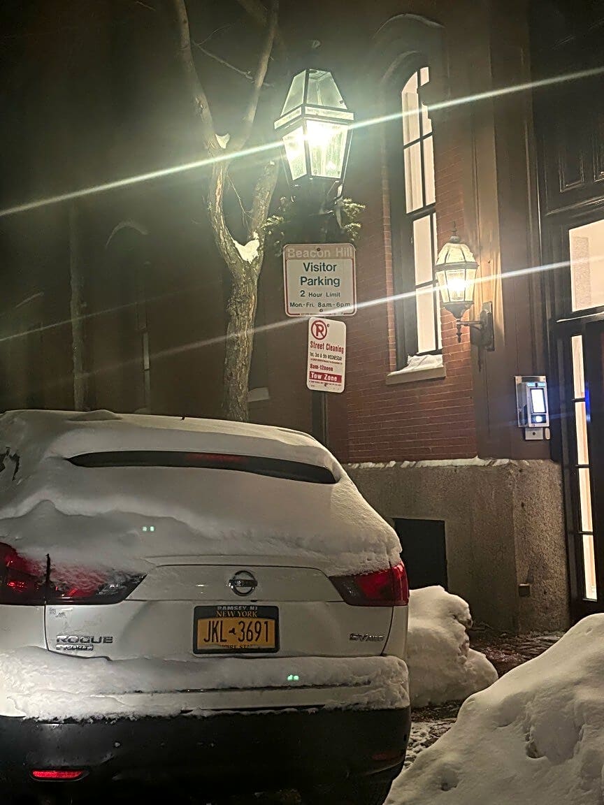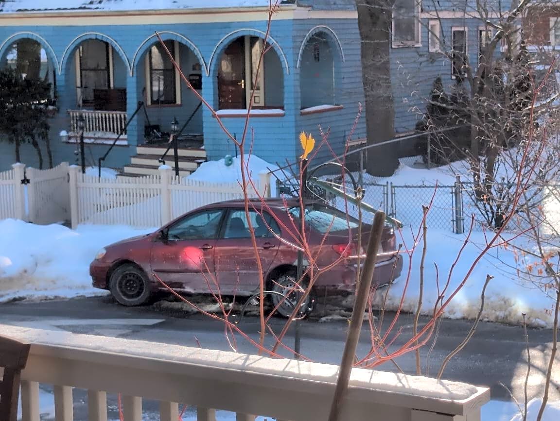 6 Lindsey St, Dorchester, Ma, 02124Car parked in the middle of the street. Parked on the snow bank, no room for other cars to get by.
