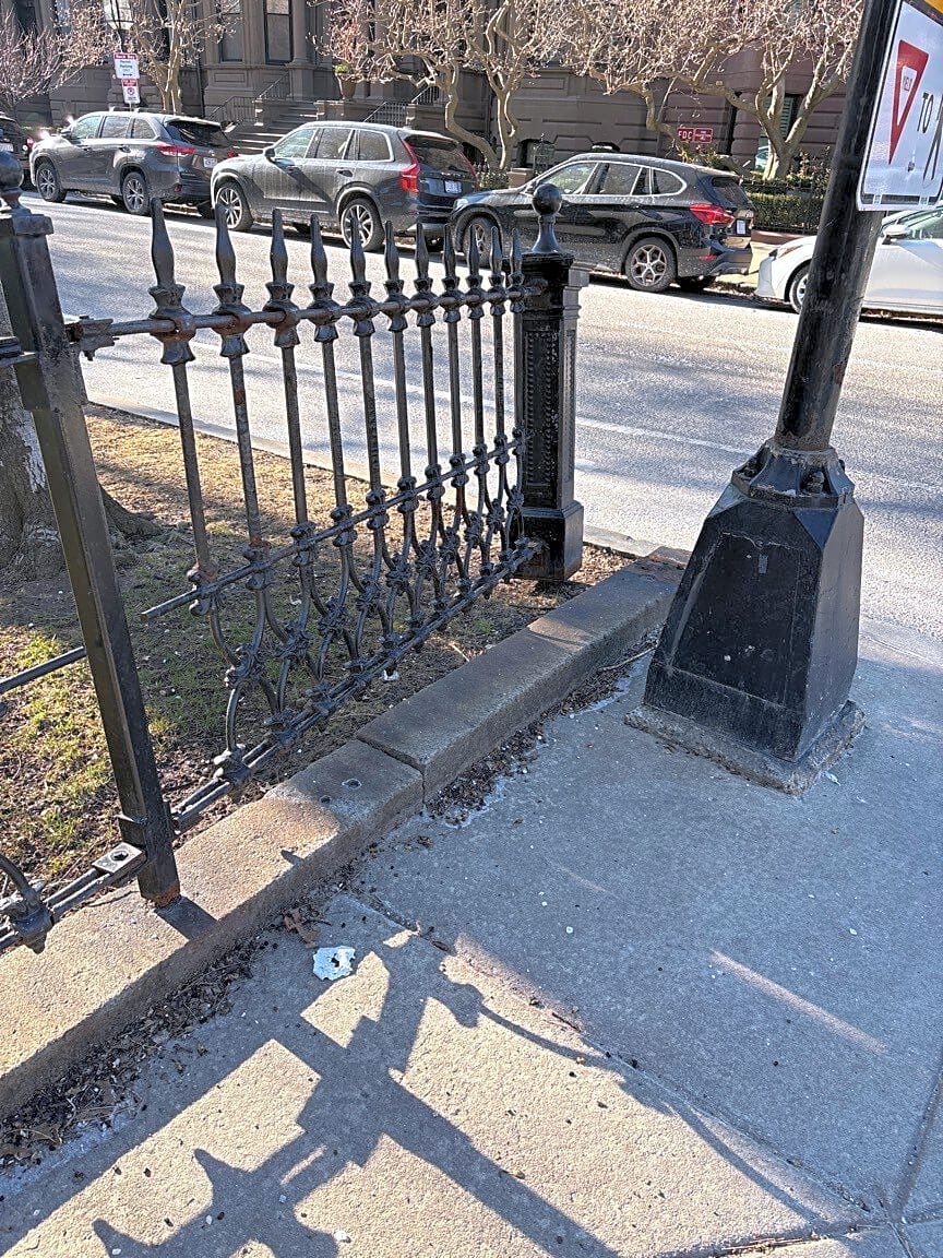 Berkeley St & Commonwealth AveOrnamental iron fence knocked out of position on NW corner of B to C block of Commonwealth Mall at intersection of Berkeley and Commonwealth on outbound side. Traffic signal also off kilter.