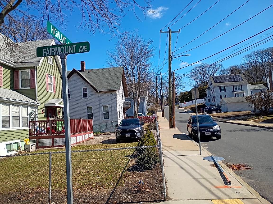 Intersection Of Fairmount Ave And Highland St, Hyde Park, MaStop sign down. Corner of Fairmount Ave. And Highland st. Hyde park