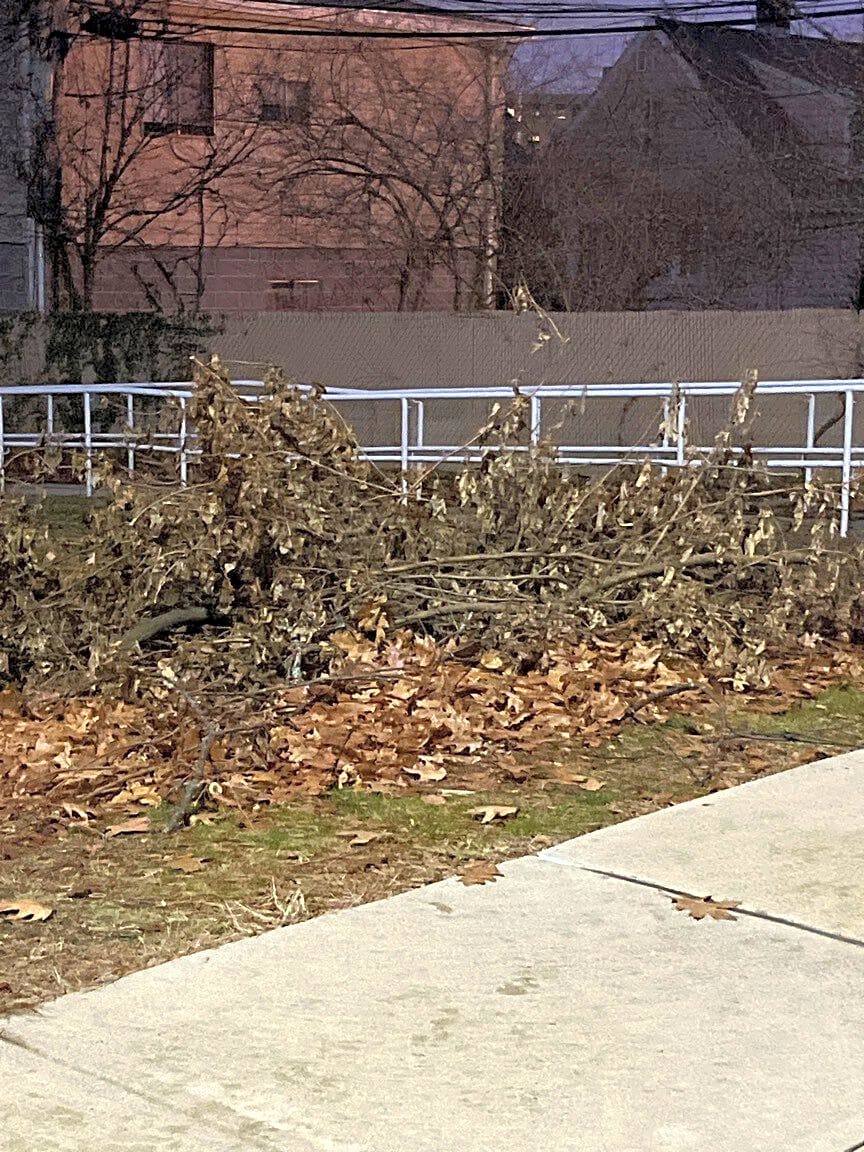 40 Academy Hill Rd, Boston, MA 02135Huge pile of branches outside Brighton BPL branch, has been here for weeks