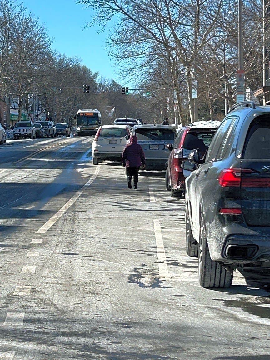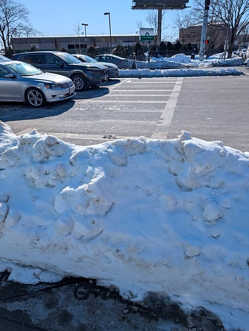 Intersection Of Massachusetts Ave And Southampton St, Roxbury, MaBlocked crosswalk. No way to cross without waking in traffic