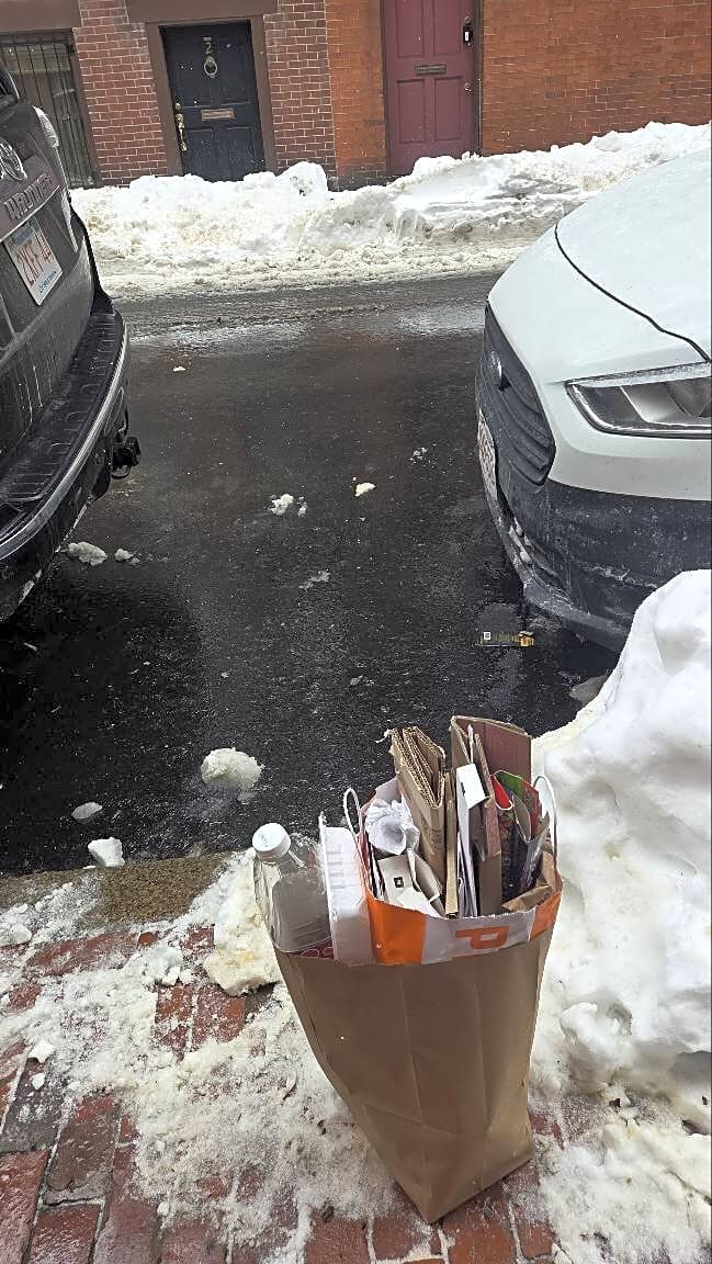Intersection Of Braemore Rd And Chiswick Rd, Brighton, MaThe sidewalk outside of 23 Braemore street in the Brighton neighborhood is littered and covered with trash. It’s unwalkable and because of the snow people are having to divert into the street. It’s been 10 days since they put thentrash in that spot and it’s only gotten worse.