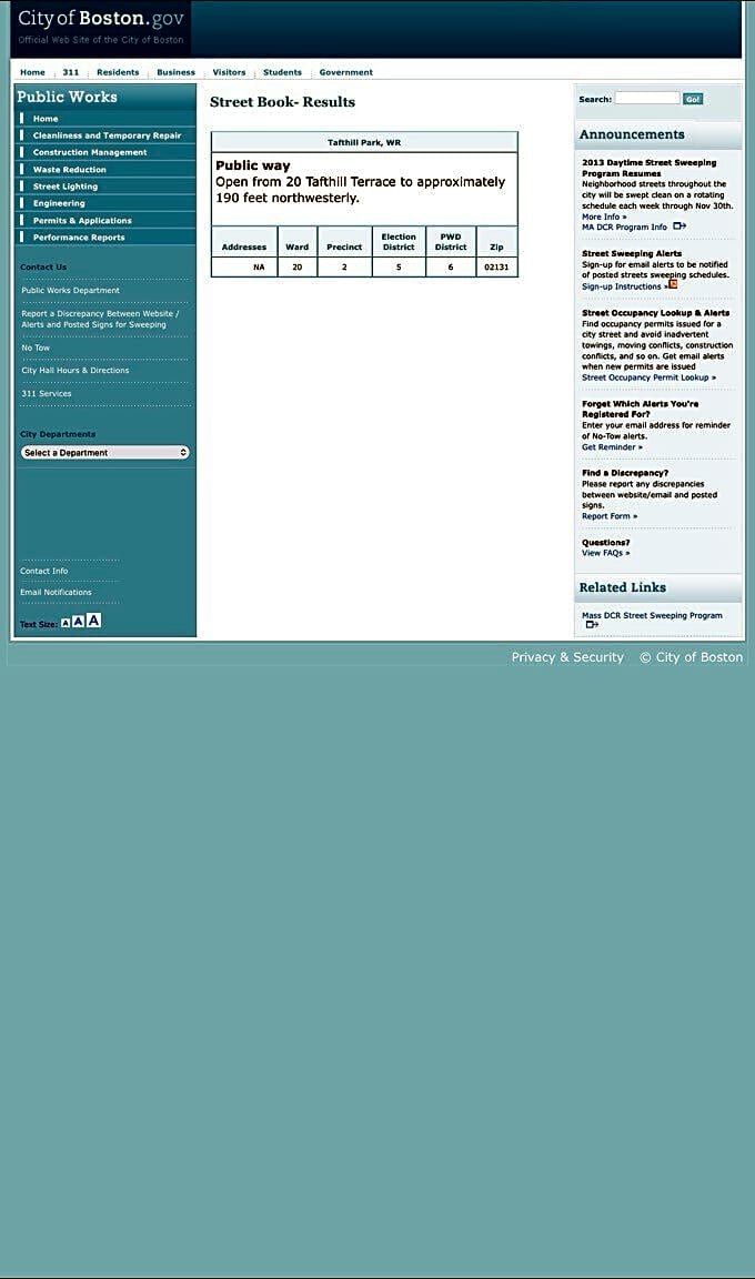 10 12 Tafthill Park, Roslindale, Ma, 02131Tafthill Park missed by shoveling operations on abutting public streets/public lot with snow plows shoveling snow into entrance & exit. No shortage of city plows in the area just not plowing this street for some reason? Let the record show that this is a public way and clearing it is a public responsibility. Not the first time this has been missed.