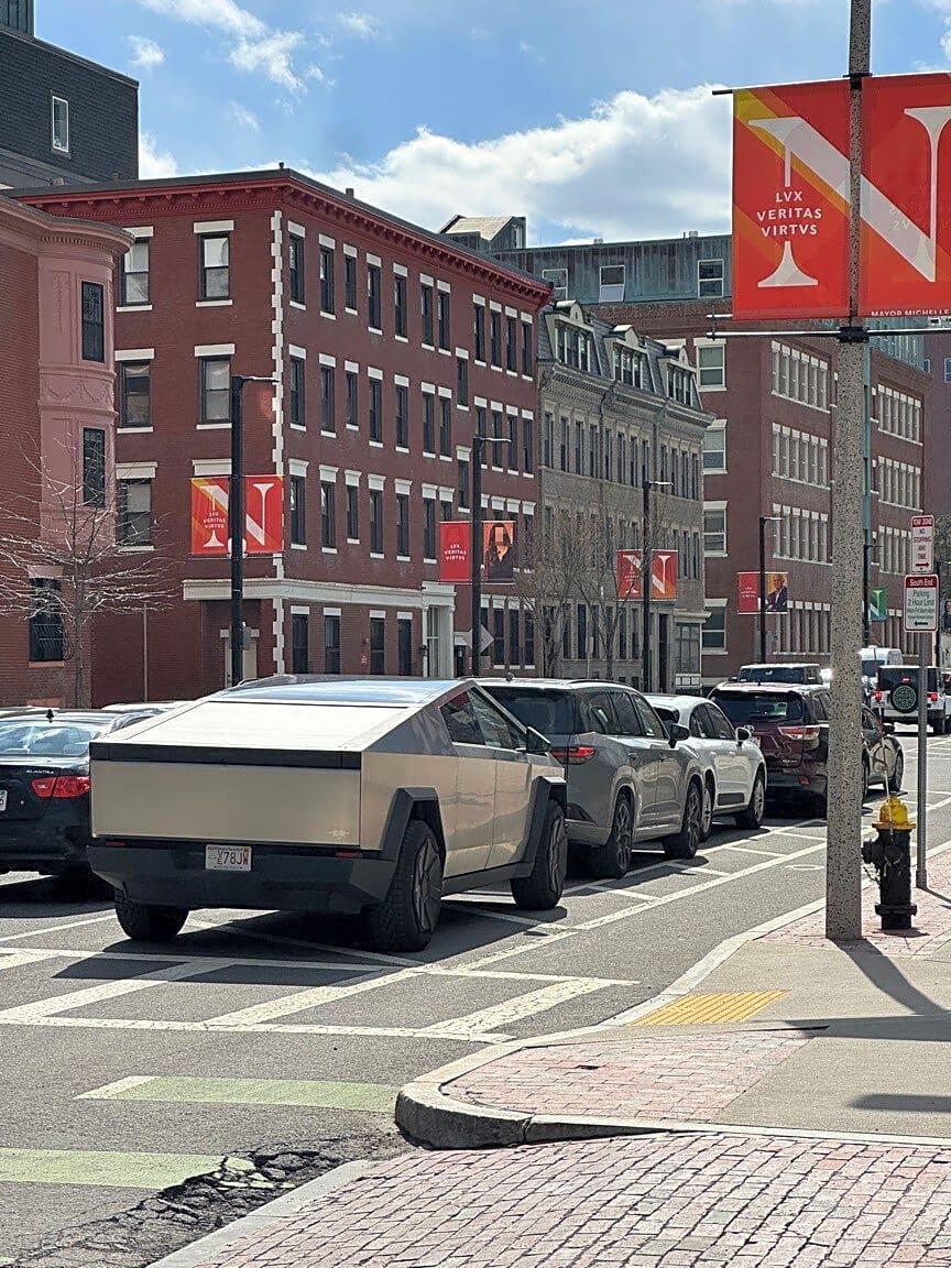 Intersection Of Columbus Ave And Burke St, Boston, MaCyber truck parked at hydrant