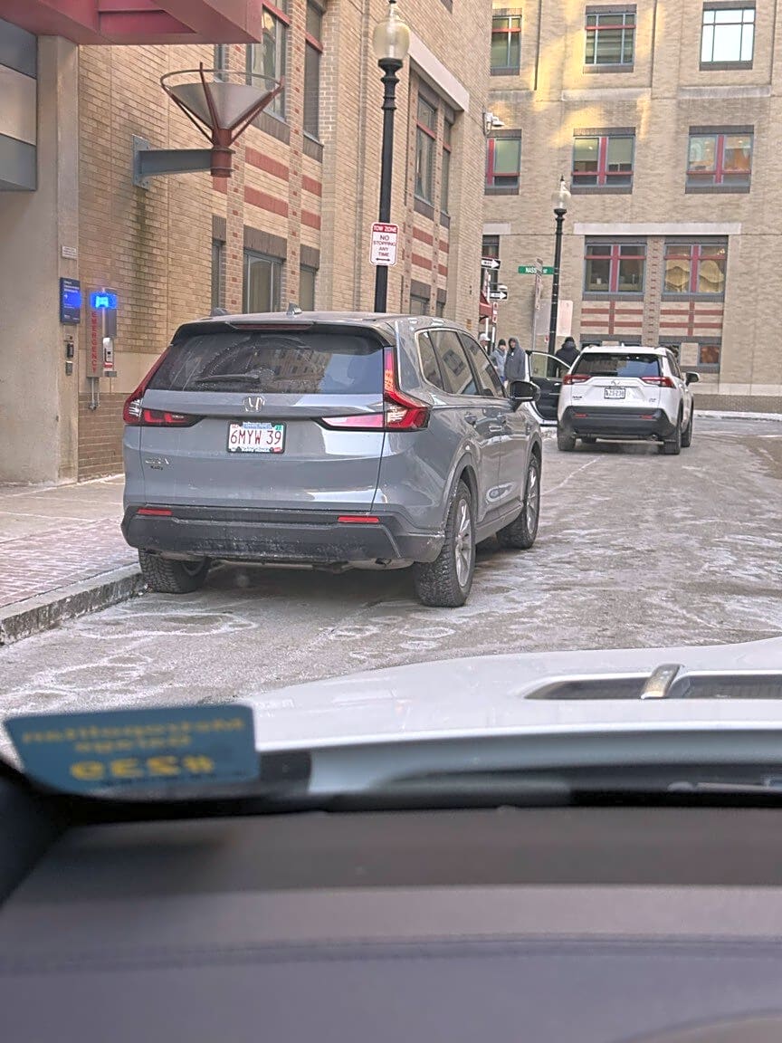 49 Gray St, Boston, Ma, 02116car parked too close to curb and trucks can not make turn, looks to already have ticket needs to be removed. | How is the car parked illegally: [Other] Make: [Kia] Model: [SUV] Color: [Black] Vehicle License Plate Registration: [5HRV98] Vehicle License Plate State: [MA]
