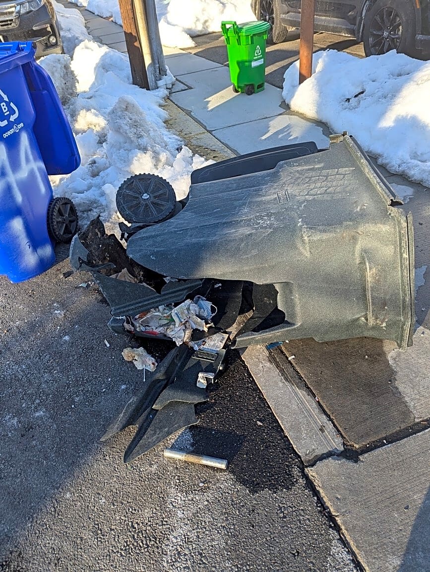 44 Portsmouth St, Brighton, Ma, 02135My trash can was run over by a car and cannot be used anymore. How can I get the damaged one picked up and requested a new one? Thanks!