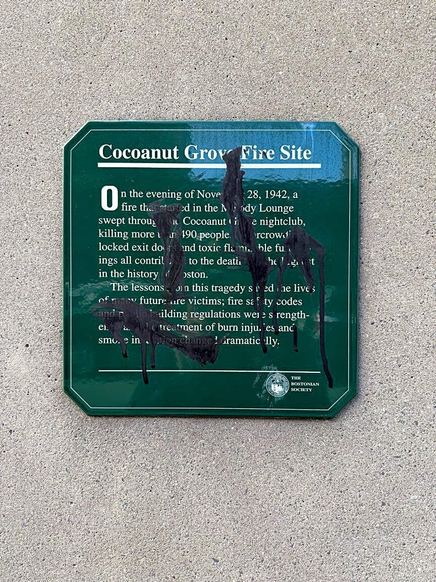 10 14 Piedmont St, Boston, Ma, 02116Cocoanut Grove memorial plaque vandalized by douchebags
