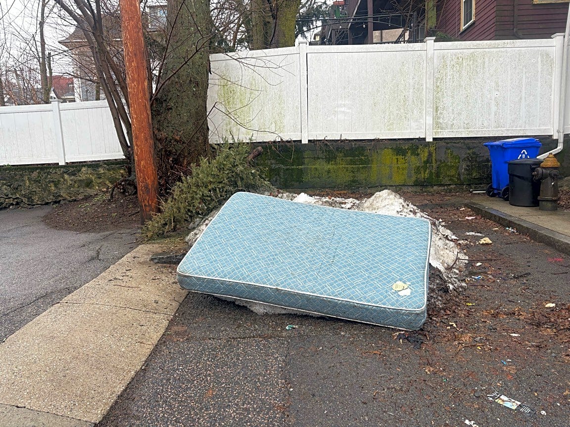 Intersection Of Public Alley No. 416 And Public Alley No. 417 And Fairfield St, Boston, MaMattress still has not been removed and has been there for 3 weeks