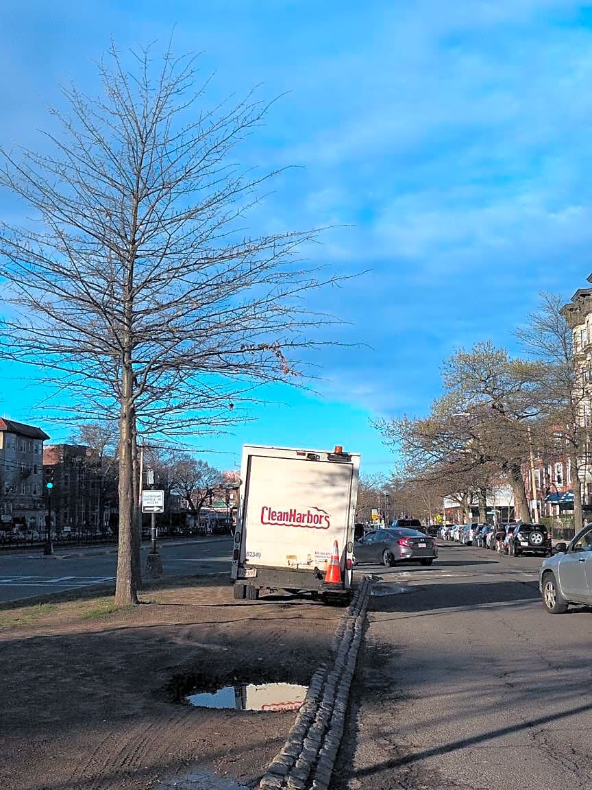 Intersection Of Griggs St And Commonwealth Ave, Allston, MaClean Harbors truck (MA X29-699) parked on grass