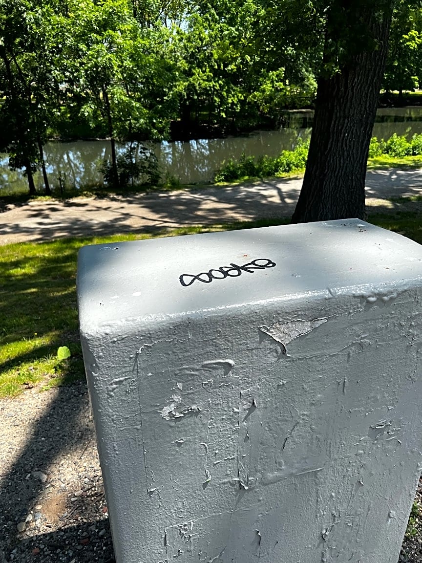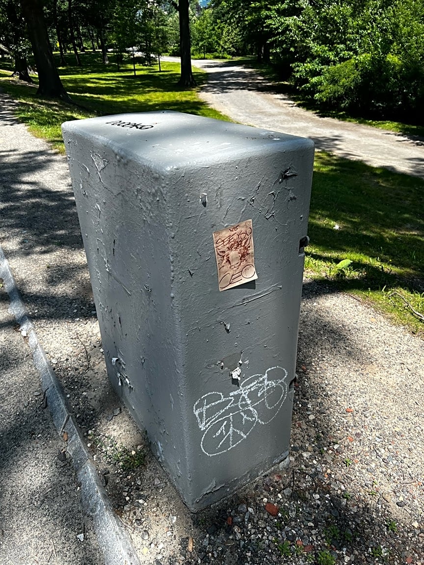 Intersection Of Palace Rd And Fenway, Boston, MaGrafitti multiple sides of control box on path on Lost Emerald Necklace side
