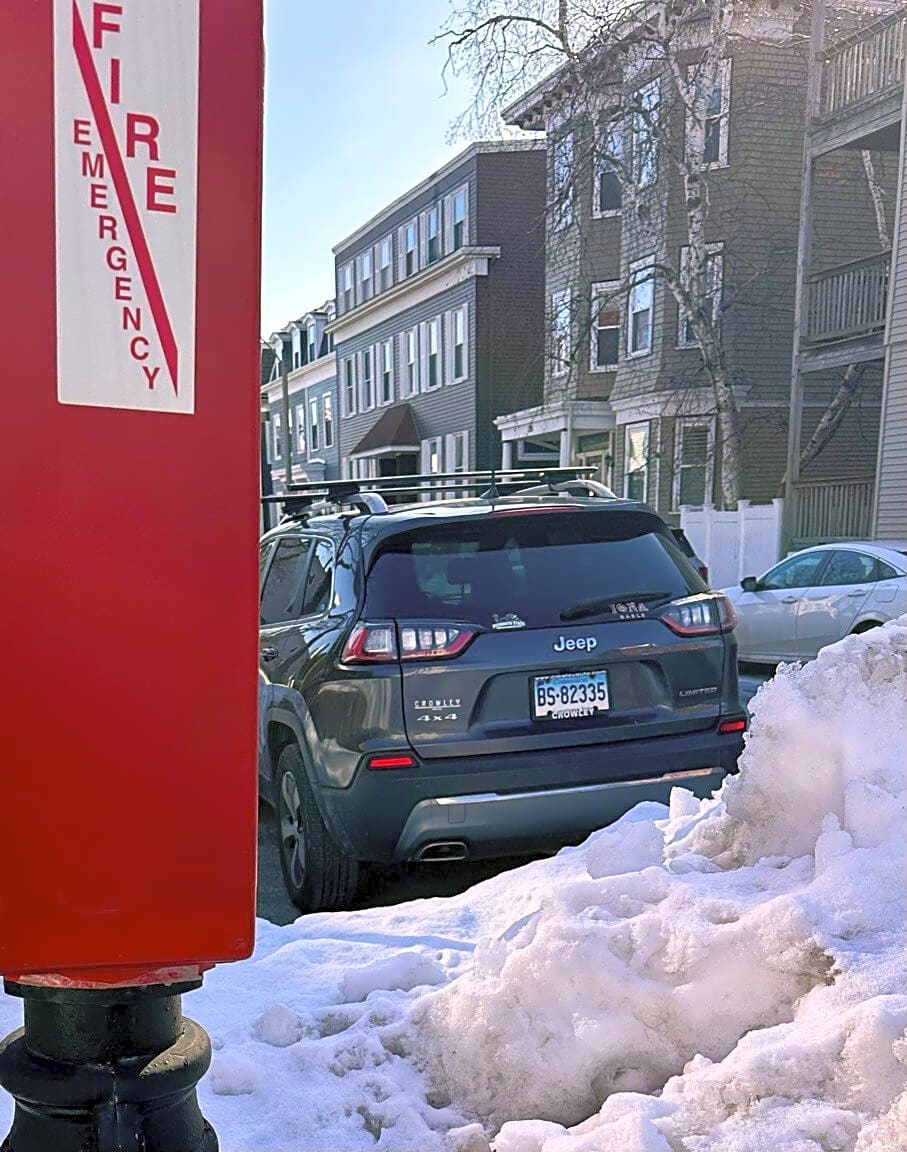 Intersection Of O St And E Fifth St, South Boston, MaJeep with Connecticut plate BS 82335 has been parked in the same spot for several days. They also had the audacity to mark the spot several times over the course of the weekend.