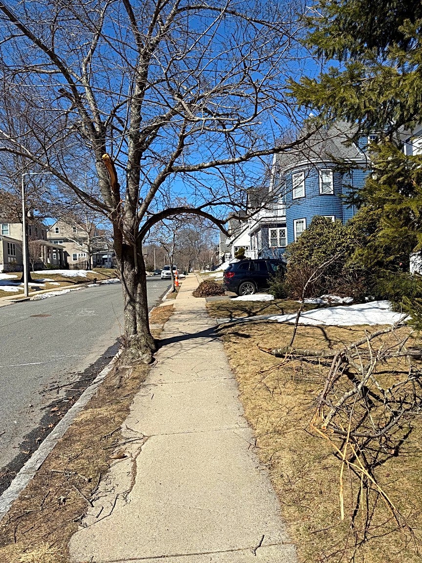 93 Moraine St, Boston, MA 02130Large branch/deadwood blocking sidewalk. We use this sidewalk daily with large groups of young school children so we’d be grateful if someone could come remove it. Thank you so much!