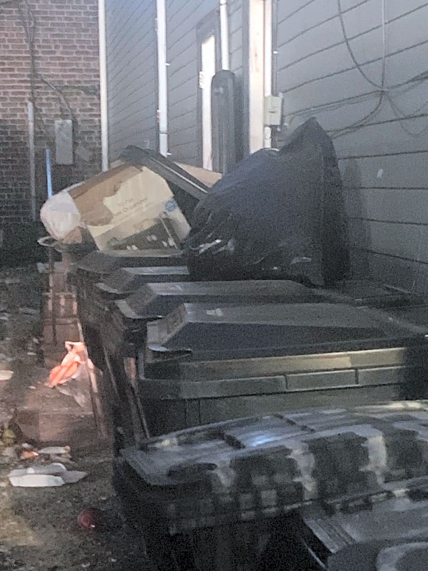 582 Dorchester Ave, South Boston, Ma, 02127Overflowing barrels and loose cardboard boxes -in the rear of red line pizza at 582 Dorchester Ave