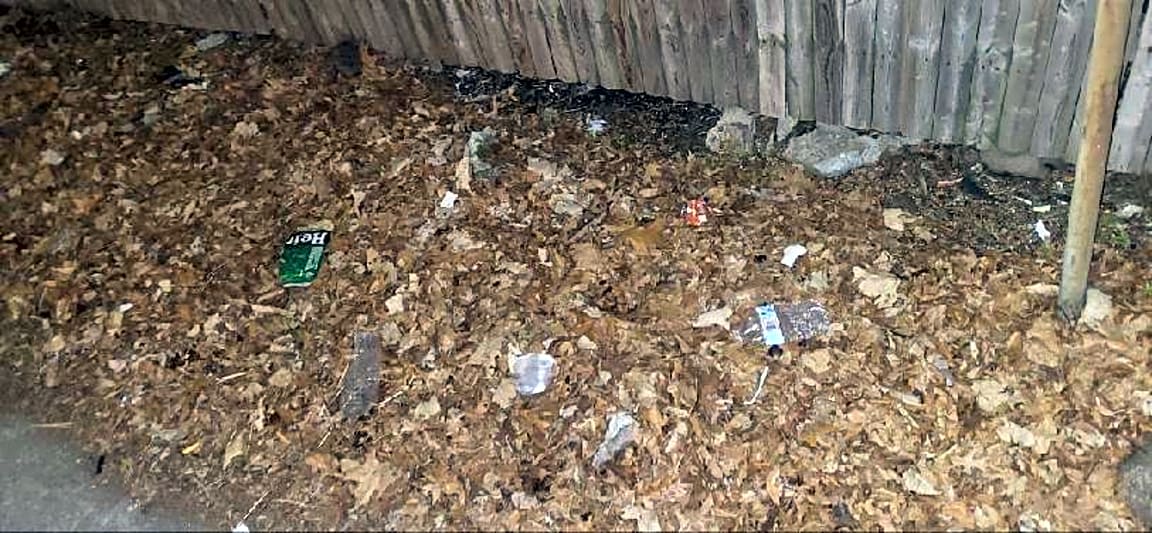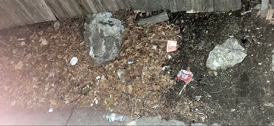 15 Radnor Rd, Brighton, Ma, 02135Loose trash in 1st tier of front grass by bushes. There are a pair of discarded black shoes and a face mask sitting on the front grass there