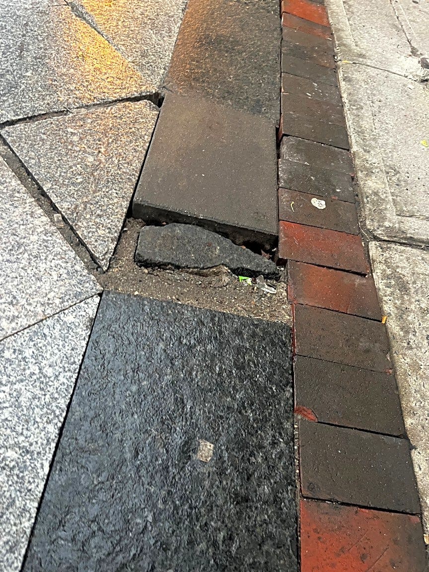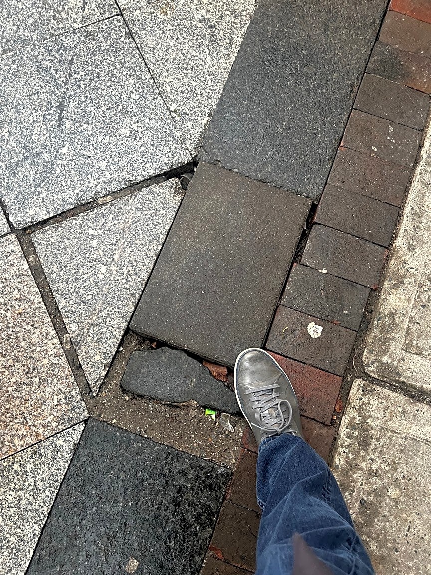 483 Beacon St, Boston, Ma, 02115There is a dent on the sidewalk where the texture of the pavement is different: softer and water absorbing. The dent is shallow but deep enough for people with mobility or eyesight issues to fall.