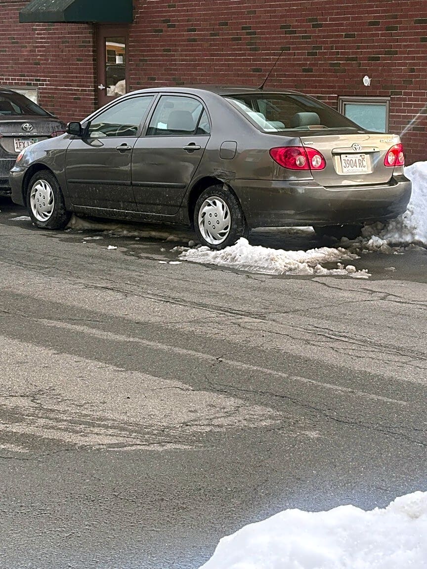 4883 Washington St, Apt 1, West Roxbury, Ma, 02132This car has not moved in months in the fall a woman used to pull up and switch out with a different similar vehicle just always having either car always parked there. Now this car has gone unmoved for over 2 months: taking up a spot all winter. GY TOYOTA COROLLA MA 3904RC