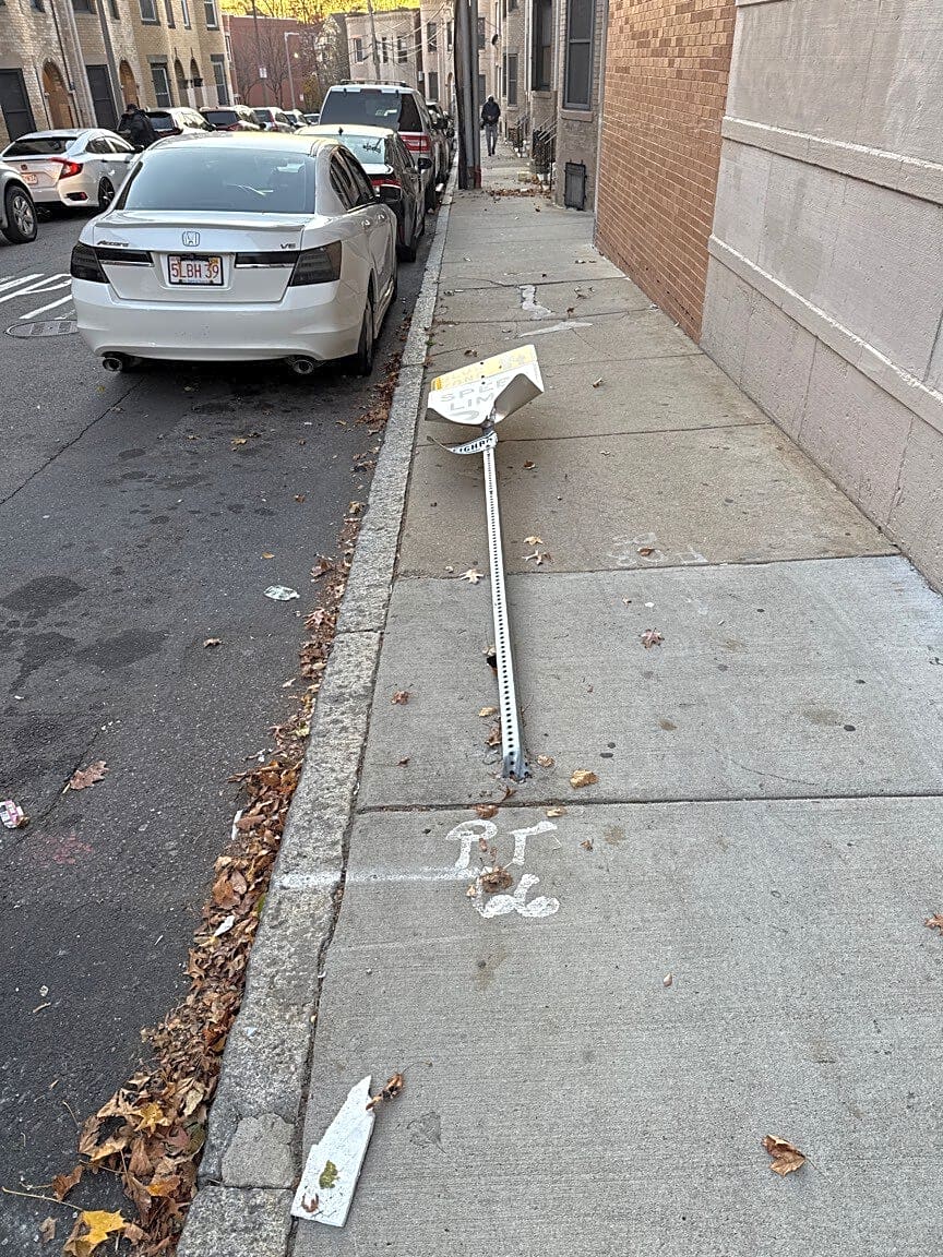 Intersection Of Athens St And Dorchester St, South Boston, MaPlease replace one way sign. This is incredibly dangerous for the narrow street. Especially with two garages (388 Athens, 472 W Broadway). Cars cannot be coming down the wrong direction. Also allowing corner parking spots on Dorchester make turning right or left impossible, hence why the street sign has been knocked down.