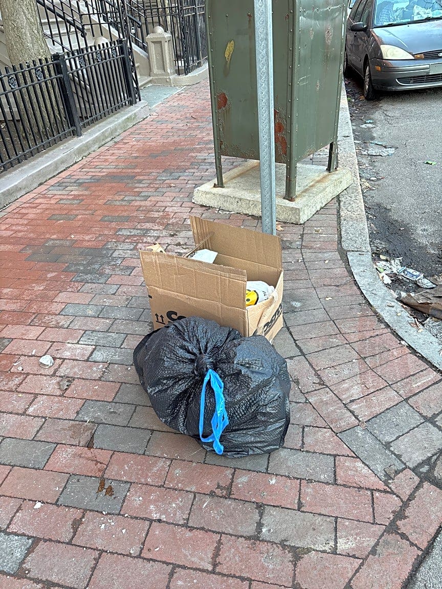 598 Tremont St, Roxbury, Ma, 02118One of our trash bags that we put out opened up and was not picked up. I called 311 and they said to repackage the trash and leave it out and it would be noted as a missed pick up to be picked up within 24 hours. I just wanted to upload a picture here for your reference. We replaced the spilled trash into these two white bags.