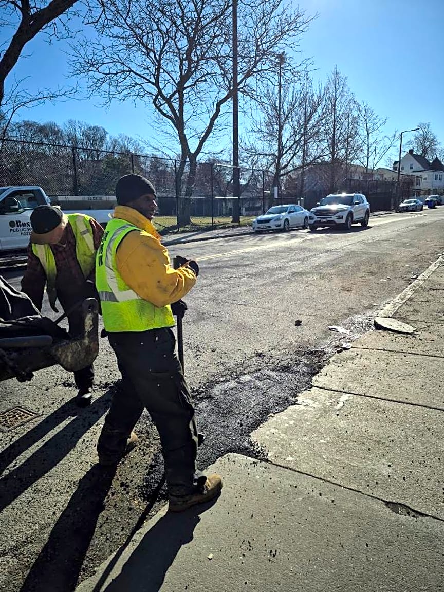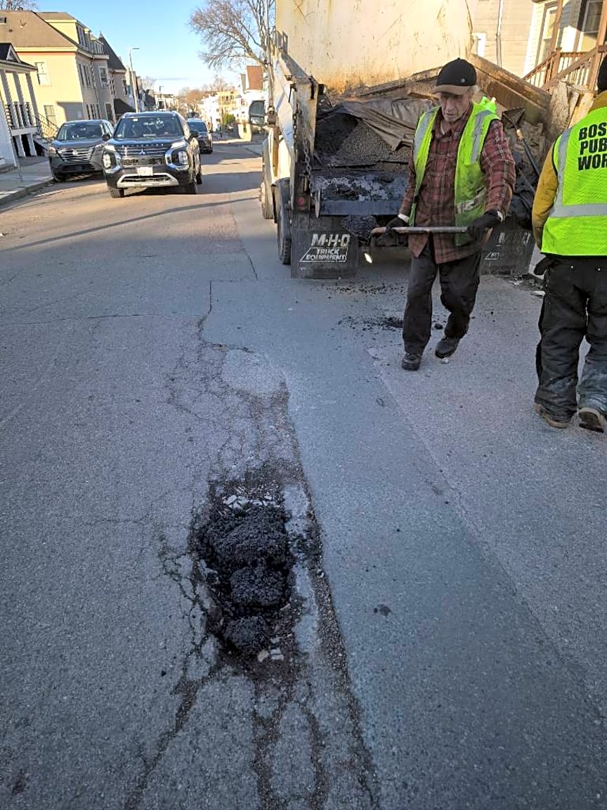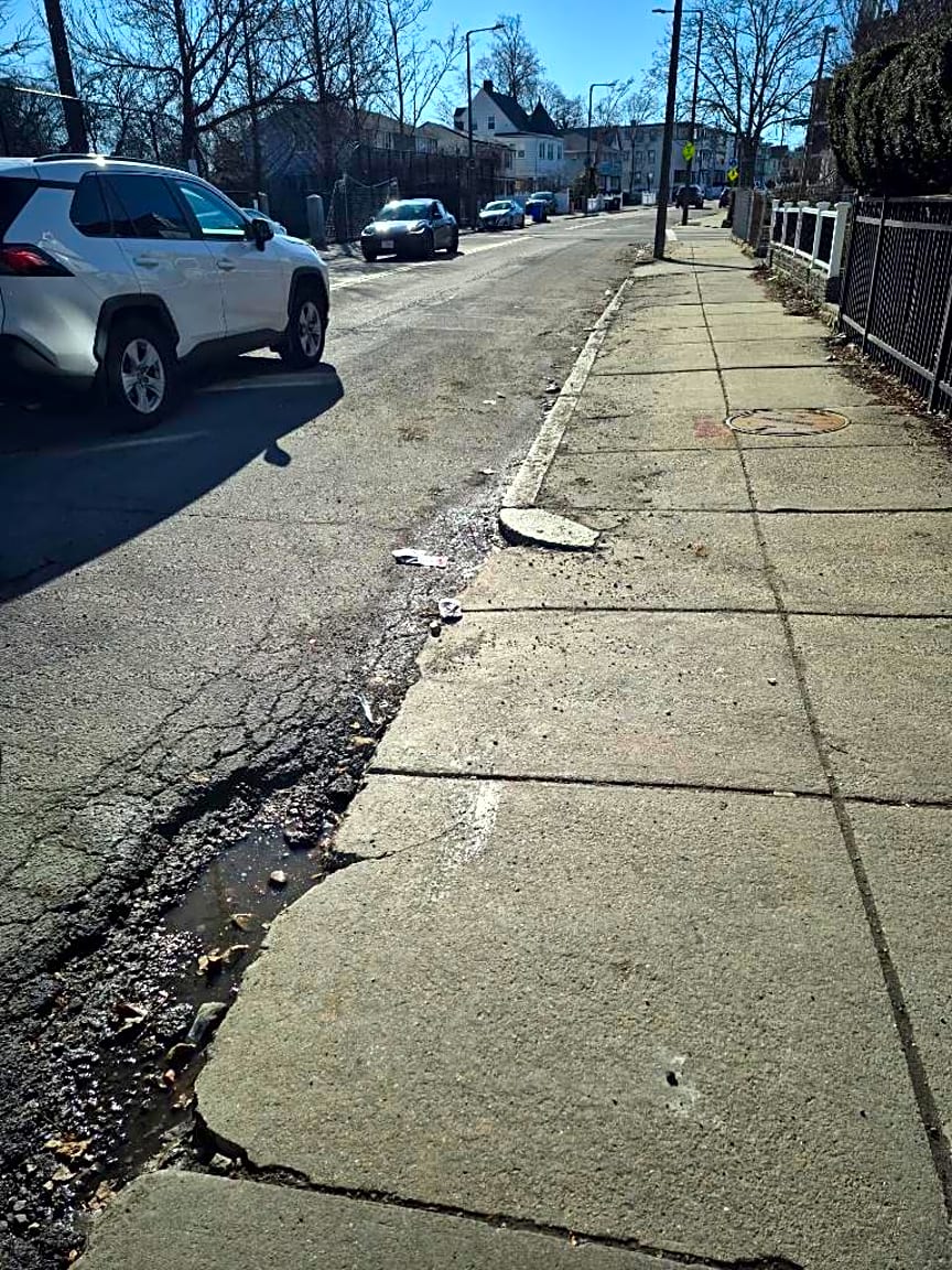 541 549 Adams St, Dorchester, Ma, 02124Large pothole and road deterioration located directly in front of the driveway entrance to Adams Court at 541 Adams St, Dorchester. The pothole runs along the curb line and partially blocks the driveway entrance, creating difficulty and potential damage for vehicles entering and exiting the property. The pavement edge is crumbling and continues to widen. Location: along the curb directly in front of the driveway entrance to Adams Court apartments at 541 Adams St. Photos att