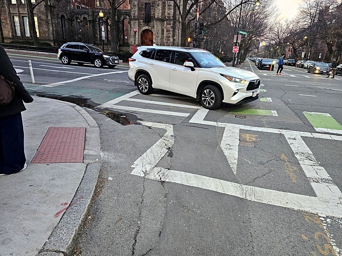 491 493 Beacon St, Boston, Ma, 02215The bike lane protections at the corner of Massachusetts Avenue and Beacon Street have been destroyed again. My most recent report for this problem was six months ago, #101006312611 and the CIty has taken no action on that report. For years the City has continued to install flimsy plastic markers which quickly get destroyed by the same trucks that have killed two bike riders at this corner. Thus every few months I make this same report, and for long times there are no protections in place at this deadly corner. Does a third rider need to be killed before the City takes this responsibility seriously?