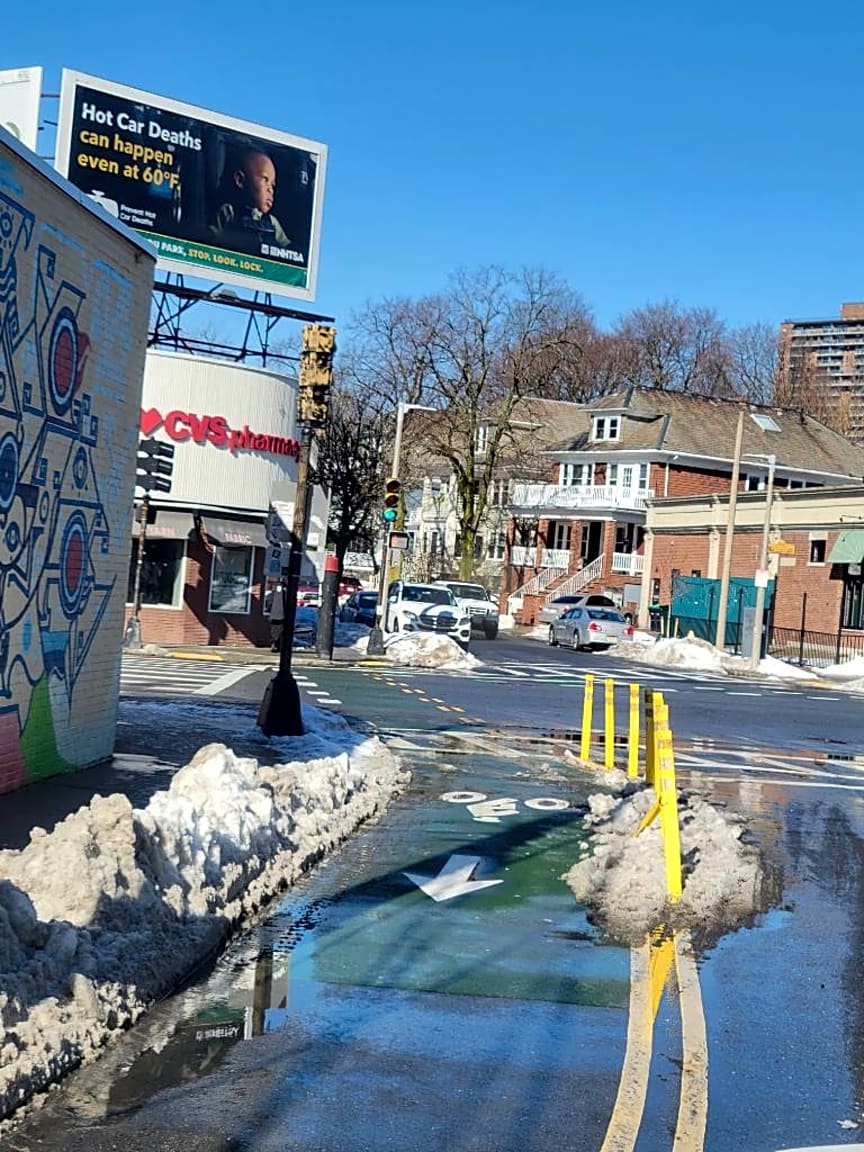 Intersection Of Clearway St And Massachusetts Ave, Boston, MaDisplaced concrete curbing and icy snow banks are fully blocking the entrance to the southbound Mass Ave bike lane