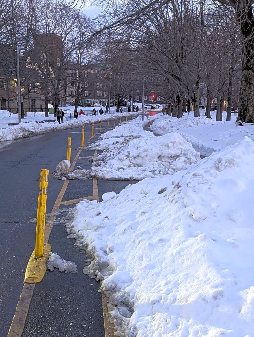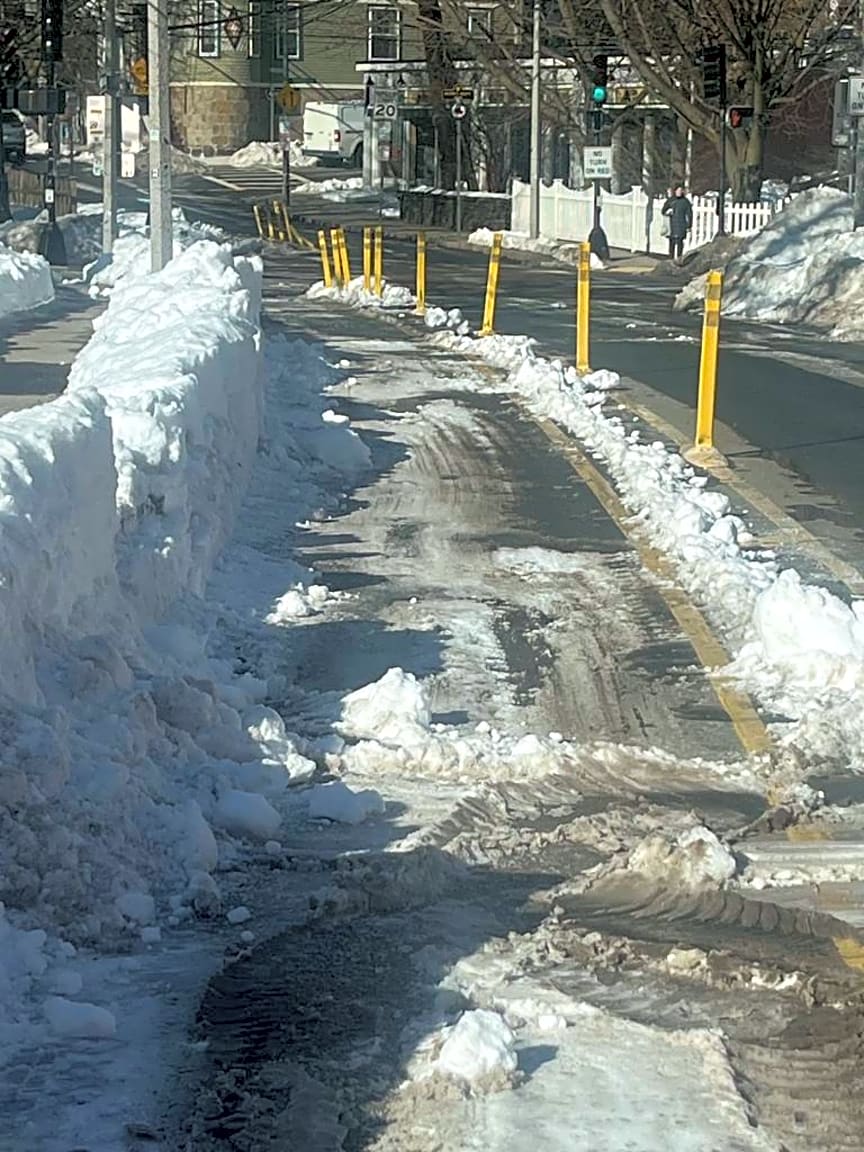 96 Boylston St, Jamaica Plain, Ma, 02130Contraflow bike lane needs plowing. Across from Stony Brook T station
