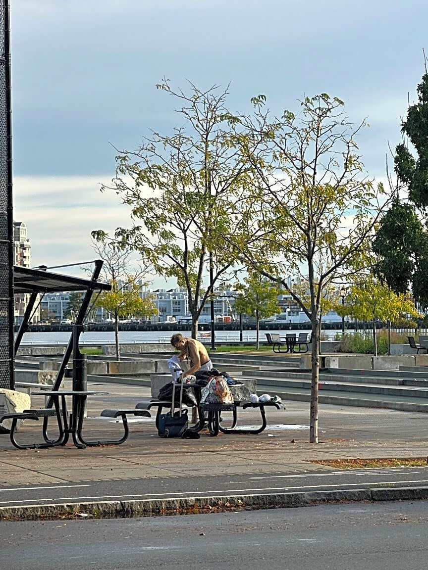 Intersection Of Copp's Hill Ter And Commercial St, Boston, MaEncampment on the Bocce Courts in North End. Man changing in public. | Case (SR) Type: [Encampments] Referred To: [ENCAMPMENTS]