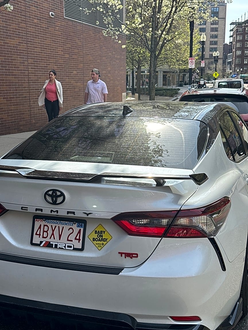 Intersection Of Charles St S And Park Plz, Boston, MaThe vehicle, a white Toyota Camrywith license plate 4BXV 24, is parked in a clearly marked “No Parking” zone.