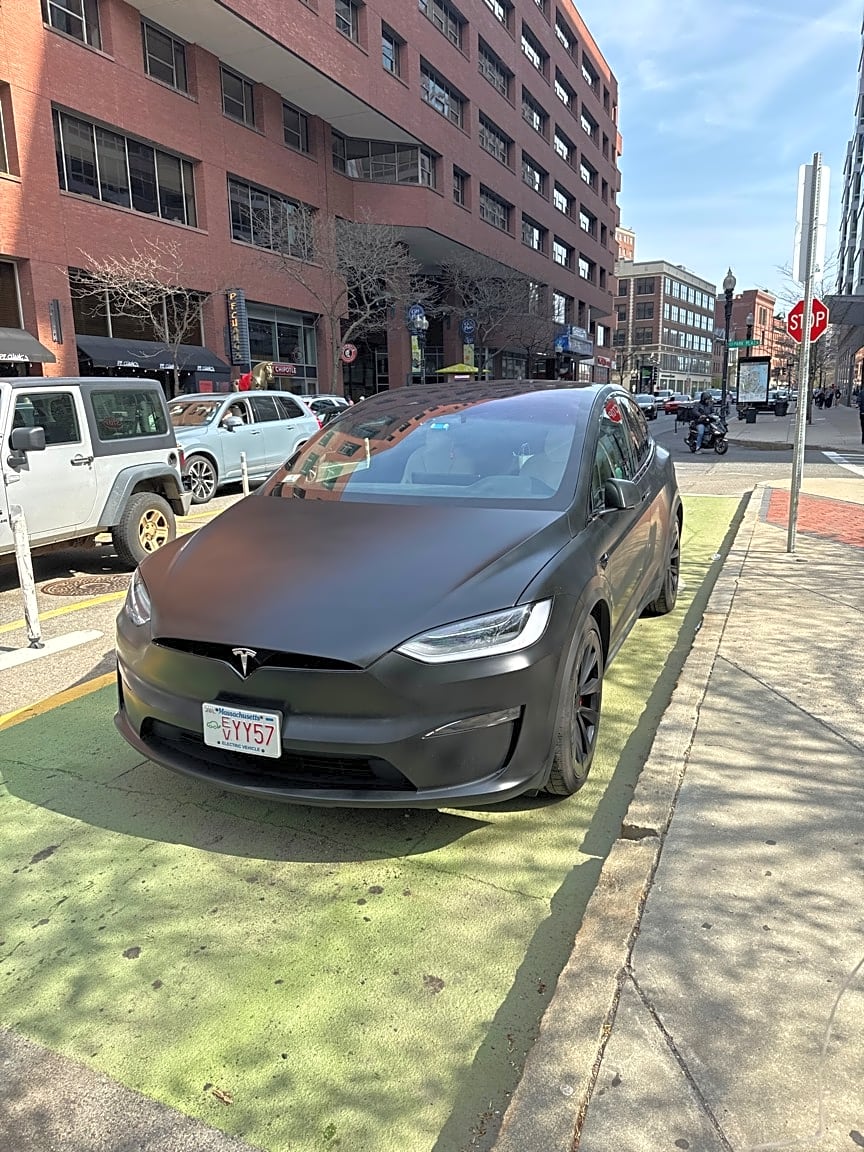 Intersection Of Charles St S And Park Plz, Boston, MaThe vehicle, a black Tesla with license plate EV YY57, is parked in a bicycle lane.