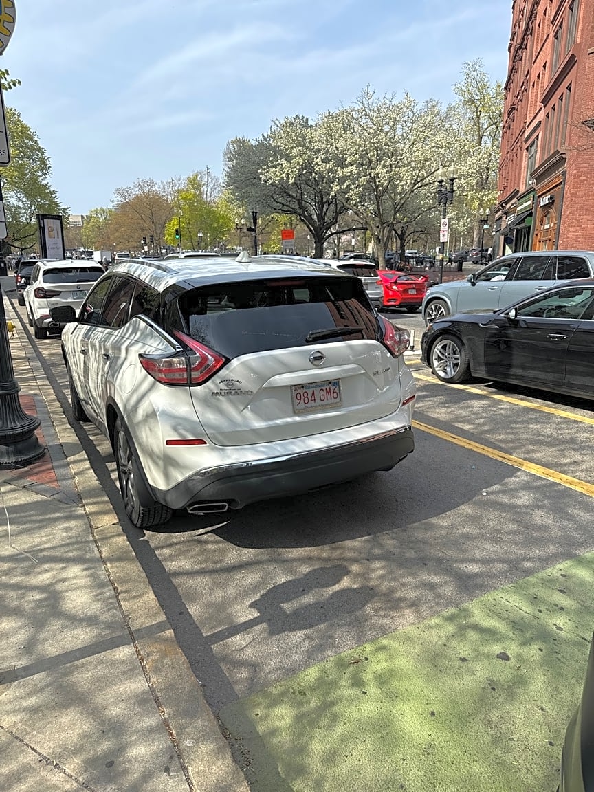 Intersection Of Charles St S And Park Plz, Boston, MaThe vehicle, a white Nissan Murano with license plate 984 GM6, is parked in a bicycle lane.