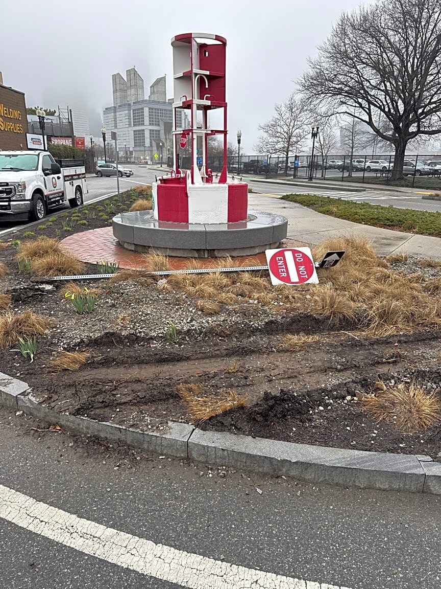 Intersection Of Foundry St And Gillette Park And Dorchester Ave, Boston, MaSign torn down in plant bed. Gravel and rocks dumped in plant bed
