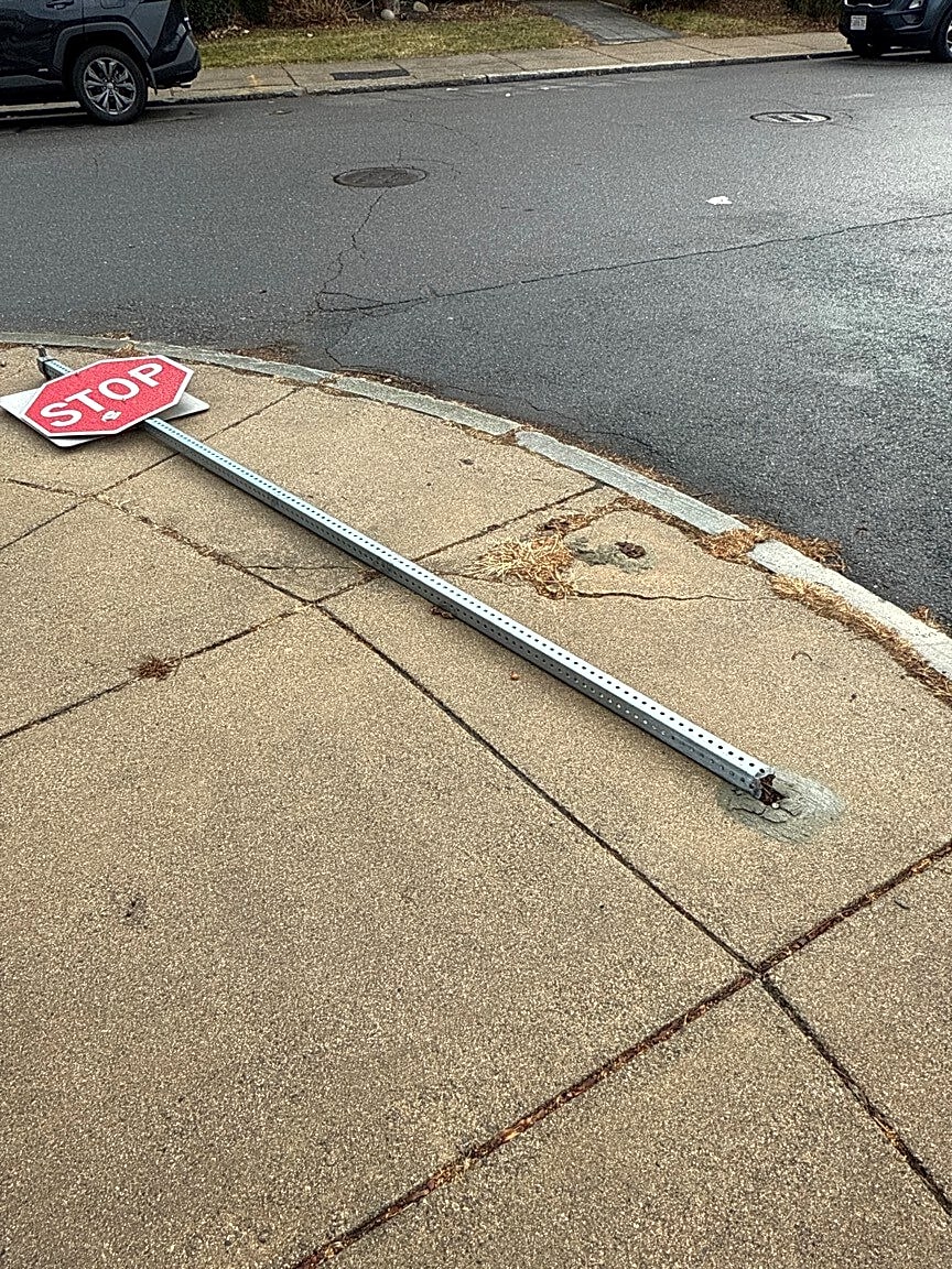 Intersection Of Alpha Rd And Waldeck St, Dorchester, MaFallen stop sign