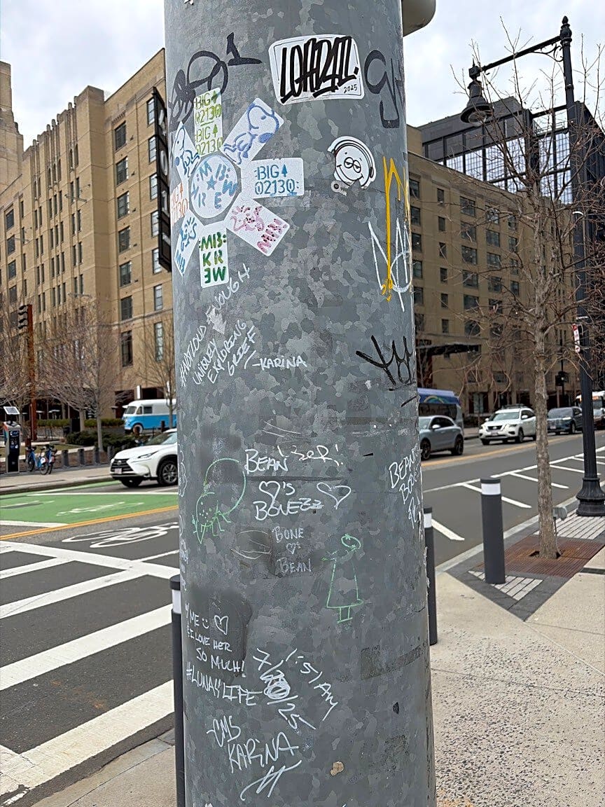 Intersection Of Boylston St And Park Dr And Brookline Ave, Boston, MaWriting and stickers on pole at intersection of boylston street, Brookline ave, and park drive