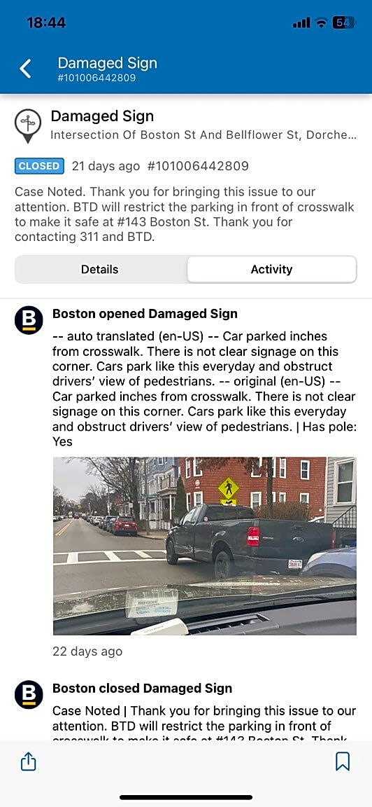 Intersection Of Boston St And Bellflower St, Dorchester, MaMissing No Parking Sign. 311 closed this ticket three weeks ago but has not installed a sign to prevent parking in front of the cross walk. Cars continue to park there. The Ped Crossing sign has also since become damaged.