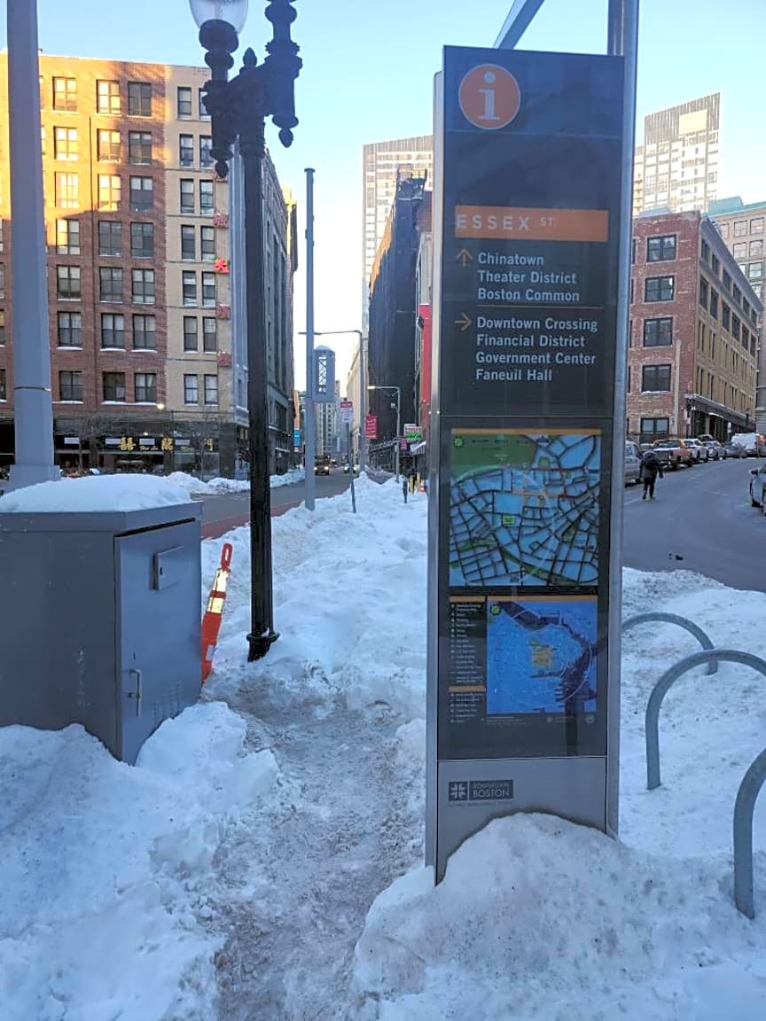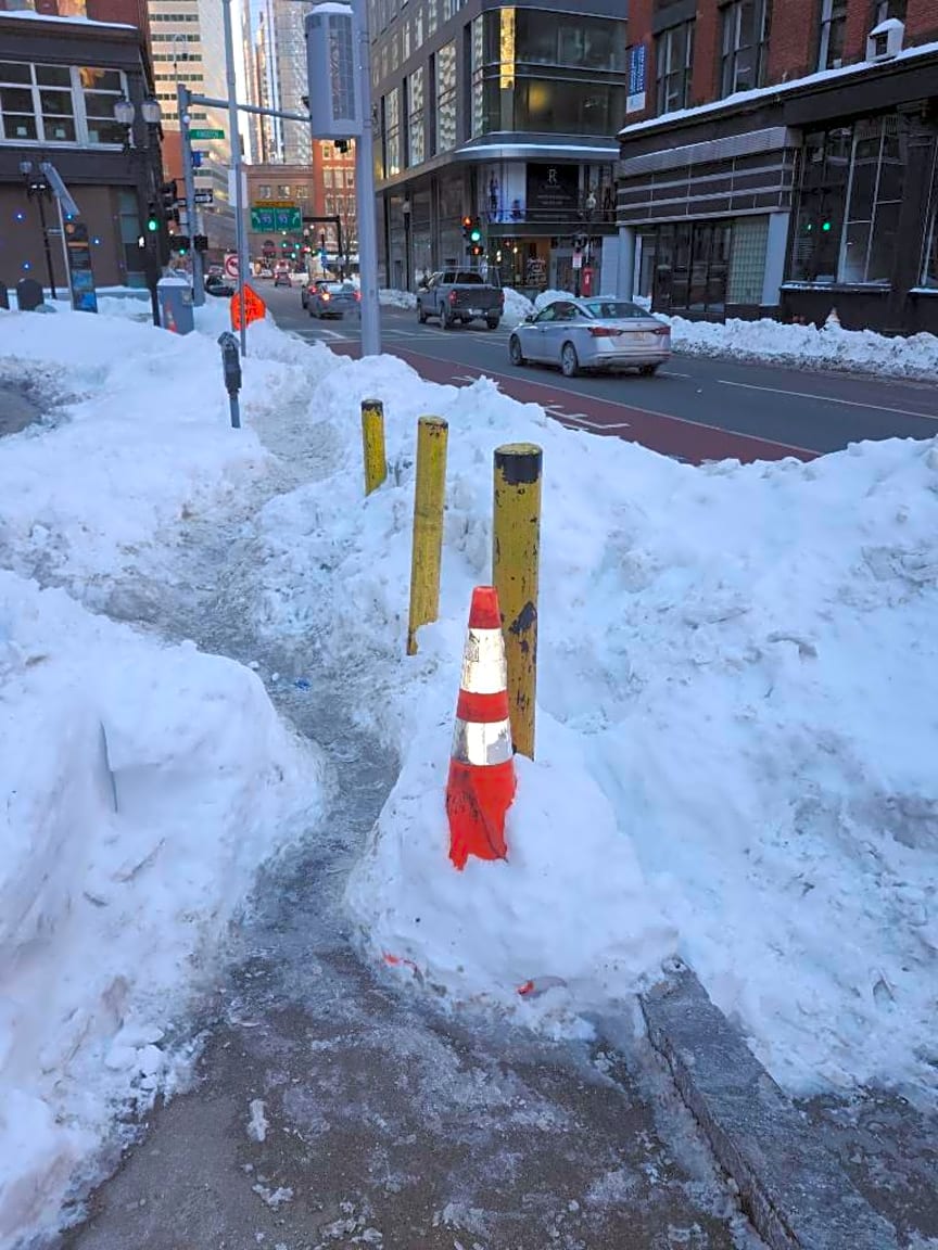 Intersection Of Kingston St And Essex St, Boston, MaThe walkway on Essex street right before Kingston cross street, left side going towards south station, is unshoveled. It is cleared up until a certain point where they encountered light poles and electrical boxes, making it impassable for a plow or snow blower. People have fallen trying to walk through the narrow trodden snow paths (photo attached) and others are walking in the bus lane to avoid the snow.