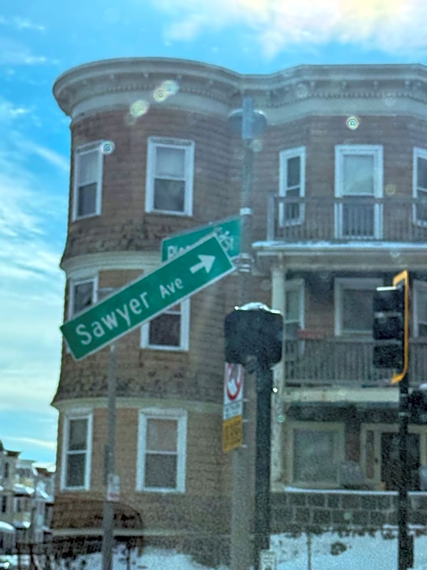 Intersection Of Sawyer Ave And Savin Hill Ave And Pleasant St, Dorchester, MaThe Sawyer Ave street sign on Sawyer and Pleasant Street is going to fall and hurt someone. The top has come undone and it's hanging loose.