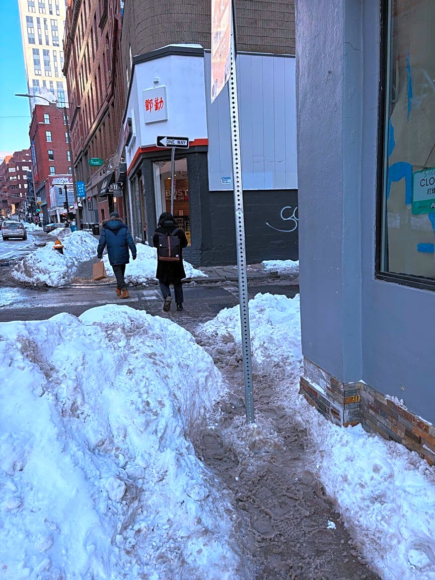20 Kneeland St, Boston, Ma, 02111Sidewalk not shoveled. Path not wide enough and obstructed by pole.