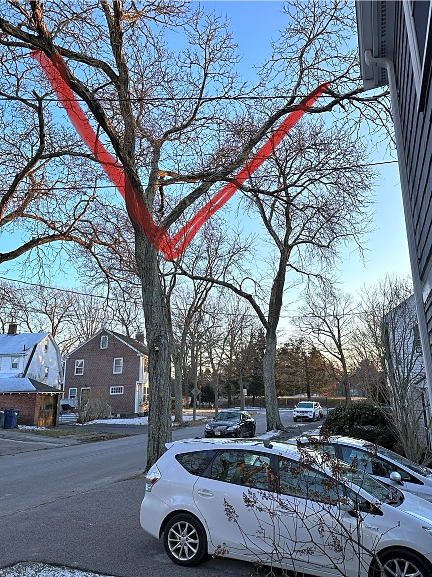 59 Redgate Rd, West Roxbury, Ma, 02132Tree limbs bending over power lines and our cars in our driveway. Very nervous that these two limbs (highlighted in pic with red lines) are going to snap, taking down the power lines and seriously damaging our vehicles. This is a city owned tree.