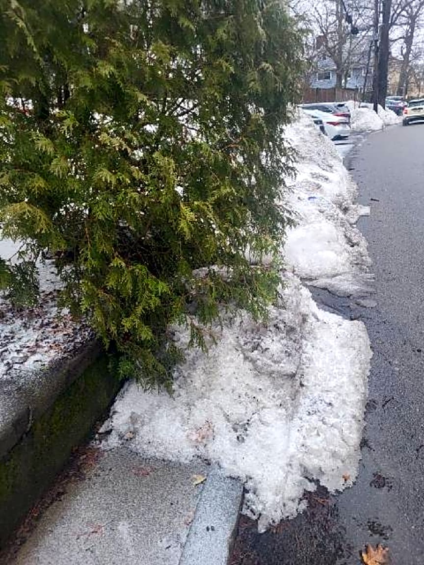 304 Spring St, West Roxbury, Ma, 02132Sidewalk not shoveled and has been completed overgrown with shrubs, making it impassable.