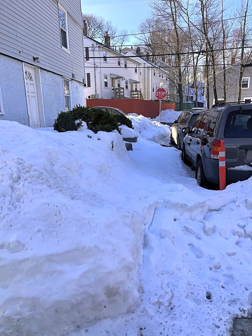 28 Eastburn St, Brighton, Ma, 02135Sidewalk is covered by snow. The sidewalk needs to be cleared for pedestrians. This is a narrow street.