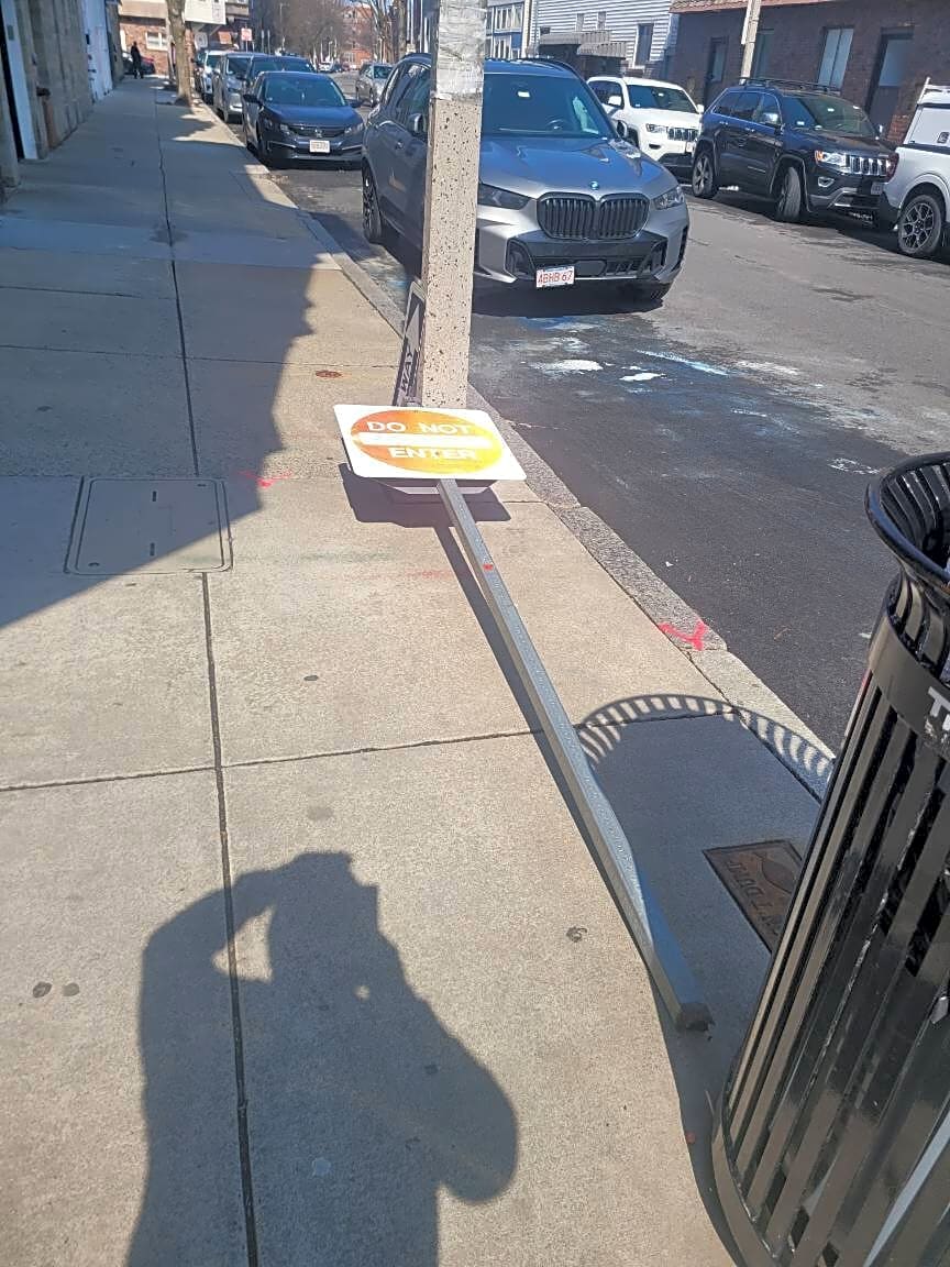 86 Cottage St, East Boston, Ma, 02128Stop sign down was hit ny a neighbor sign fell and seh drove away and parked somewhere else