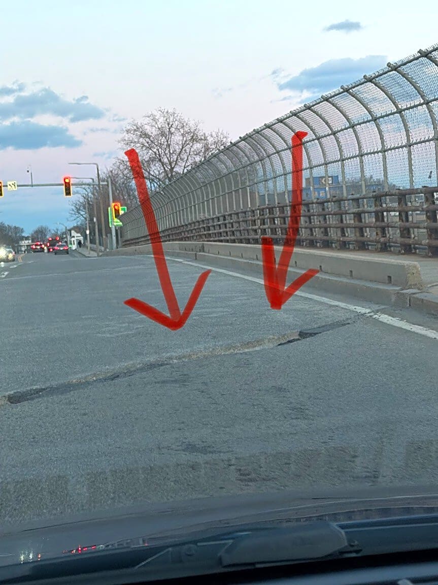 Intersection Of Southampton St And Frontage Rd, Dorchester, MaGiant pothole gap splitting the pavement on the overhang bridge over 95 next to target in Southampton street | Where exactly on the pavement is the pothole: [On Roadway] What is the approximate size of the pothole: [See picture on Images tab]